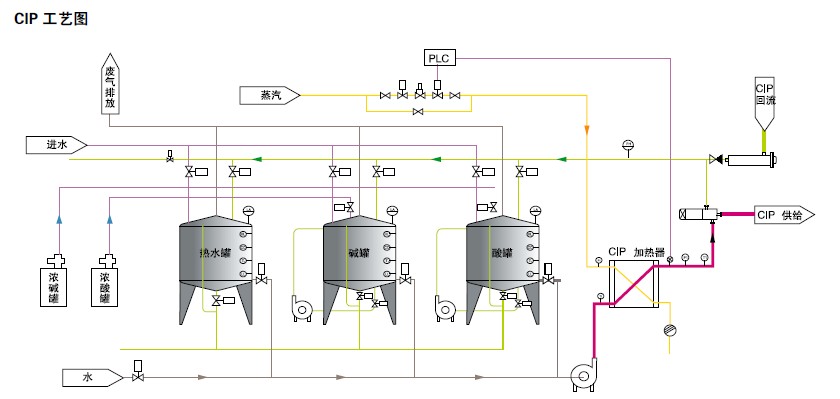 CIP 在線清洗系統是指定設備(罐體、管道、泵、過濾器等)及整條生產線在無需人工拆開或打開的前提下,在一個預定時間內,將一定溫度的清洗液通過密閉的管道對設備內表面進行噴淋循環而達到自動清洗的目的。主要由單個或多個清洗液貯罐及管道、分布器、增壓泵、回流泵、氣動控制閥、酸堿計量泵、板式換熱器、溫度控制儀、電導率檢測儀、液位控制儀及PLC 觸摸屏、控制柜等部件組成。